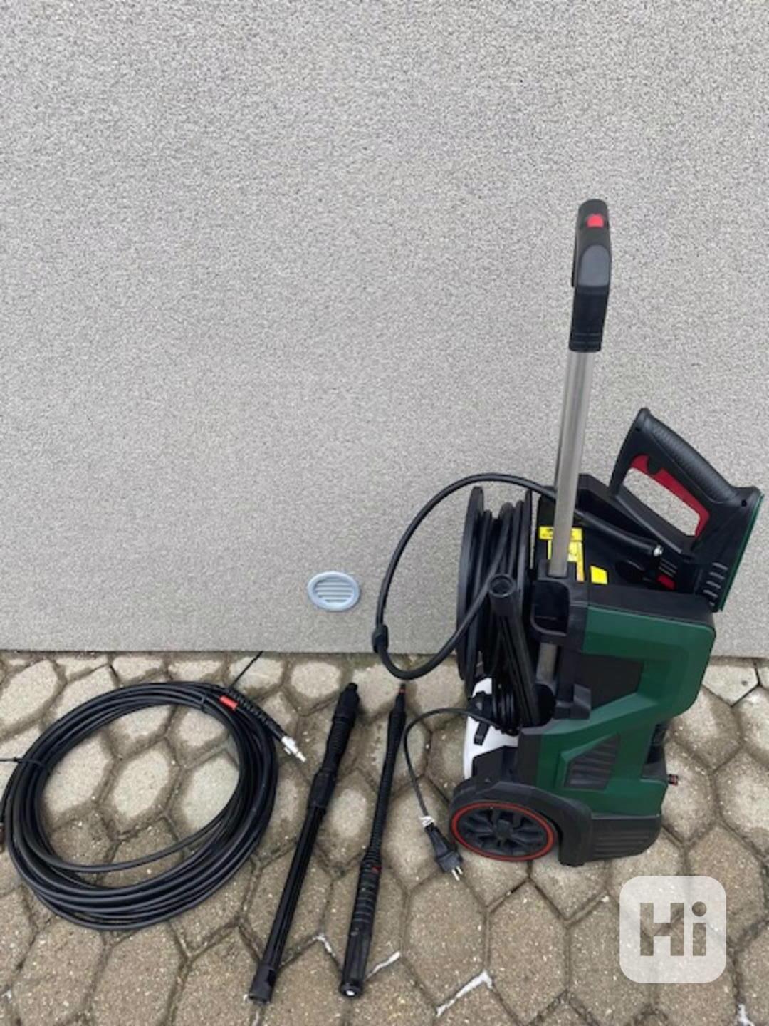 Použitá plně funkční tlaková myčka PARKSIDE PHD 170 (2 400 W, tlak: max. 17 MPa (170 bar), průtok: max. 500 l/h). Příslušenství včetně tlakové hadice na čištění potrubí a zcela nového, ještě zabaleného rotačního kartáče.